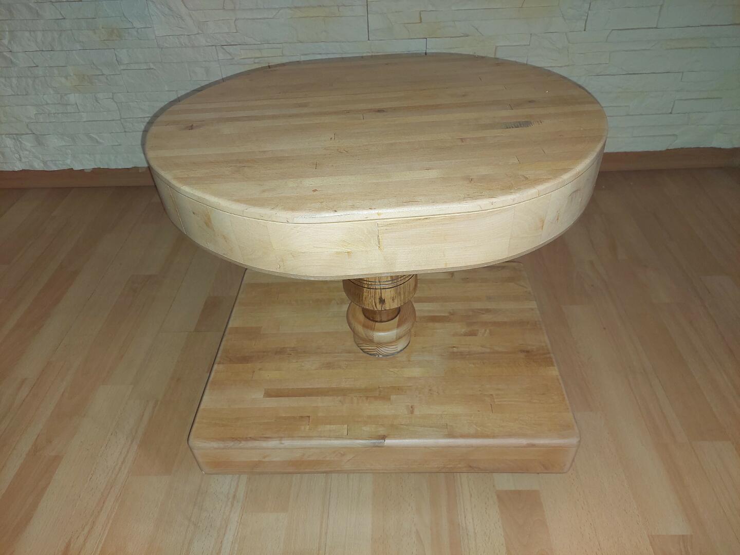 Stolik kawowy wykonany z różnych kostek drewnianych - blat obrotowy a całość jest na kółeczkach