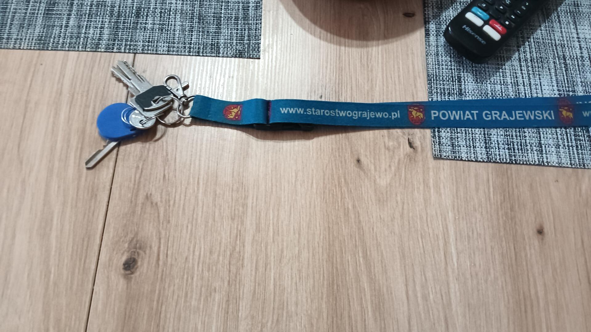 Znaleziono klucze . Na niebieskiej smyczy z napisem powiat grajewski. Zaczepione 4 klucze.